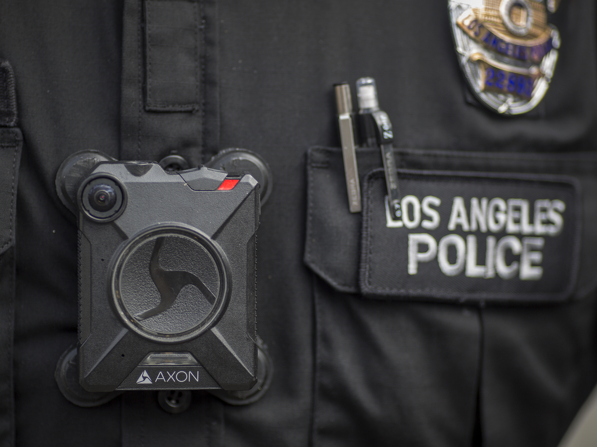 An Axon body camera worn by an officer with the Los Angeles Police Department.