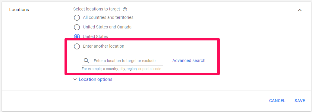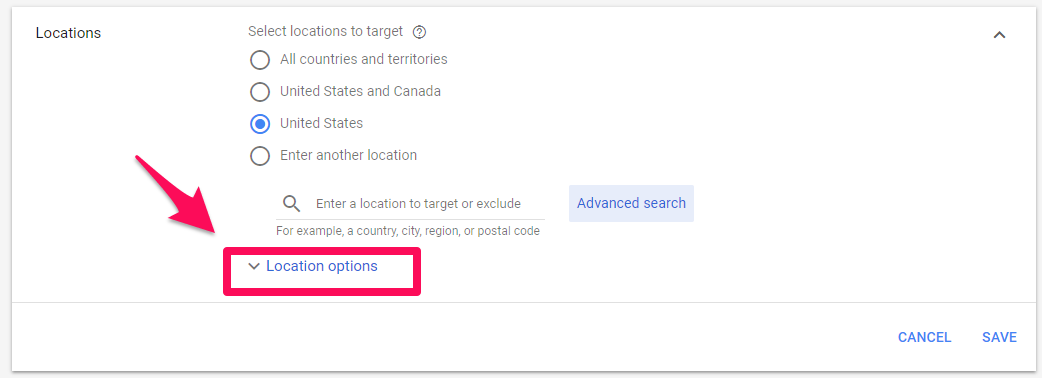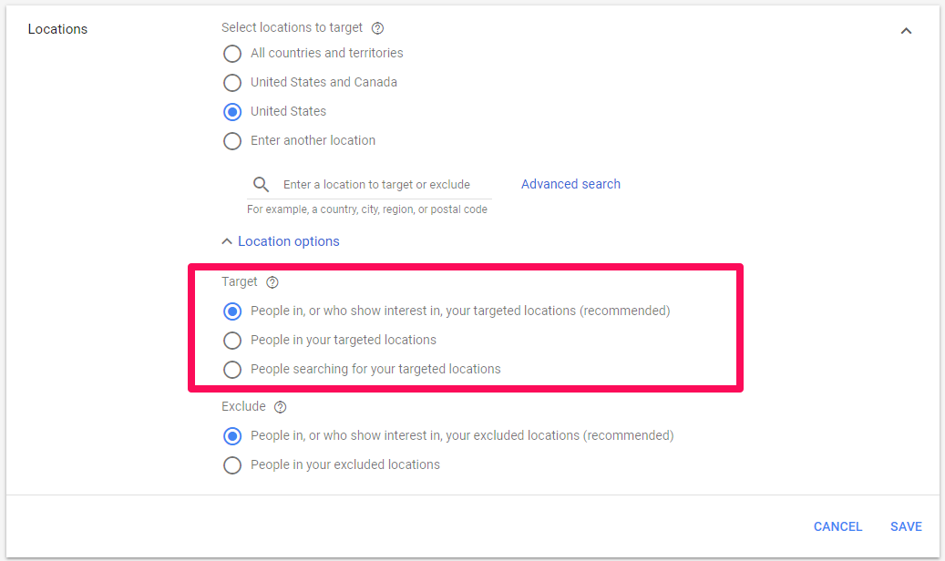 Selecting option two ensures that you are only targeting people in your target locations, rather than people who might be searching for them from across the United States (or globe).