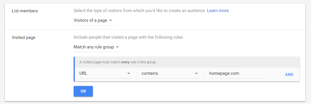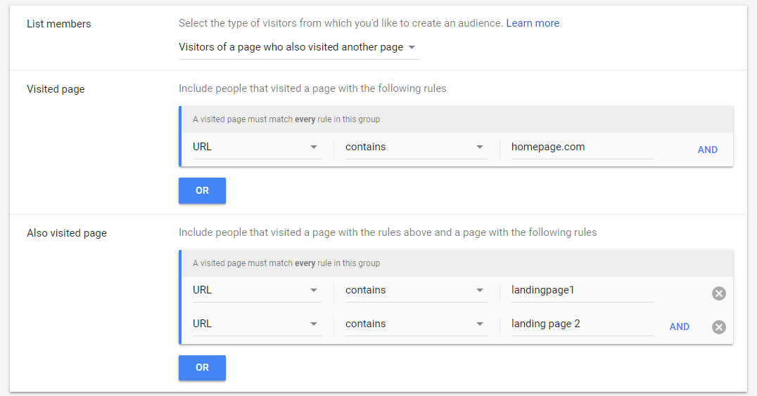 The second audience targets homepage visitors who also visited two distinct landing pages.