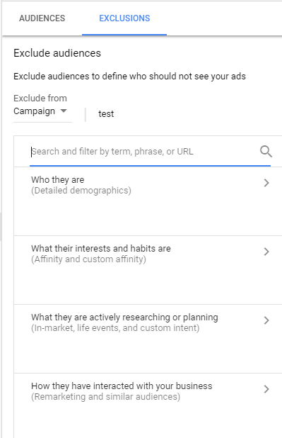 With audience exclusions, repeat the process of selecting demographics, affinities, and more audience measures that could sabotage your results.