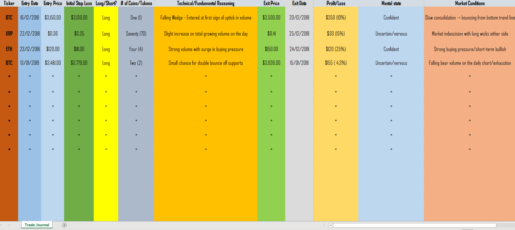 This may seem a little obvious at first glance, as all trading journals should possess an entry/exit position, the position size, and date as well as profit/loss and any stop losses you applied.