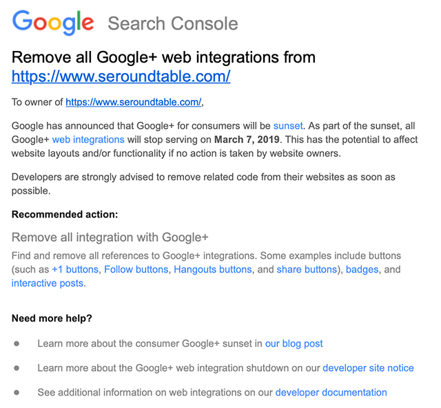 Last night, Google sent out notifications via Google Search Console reminding sites that have added Google+ buttons and other integrations to remove them by March 7th. As you know, Google is killing off Google+, the consumer version, in the next couple of months and Google wants all those Google+ buttons off the web beforehand.