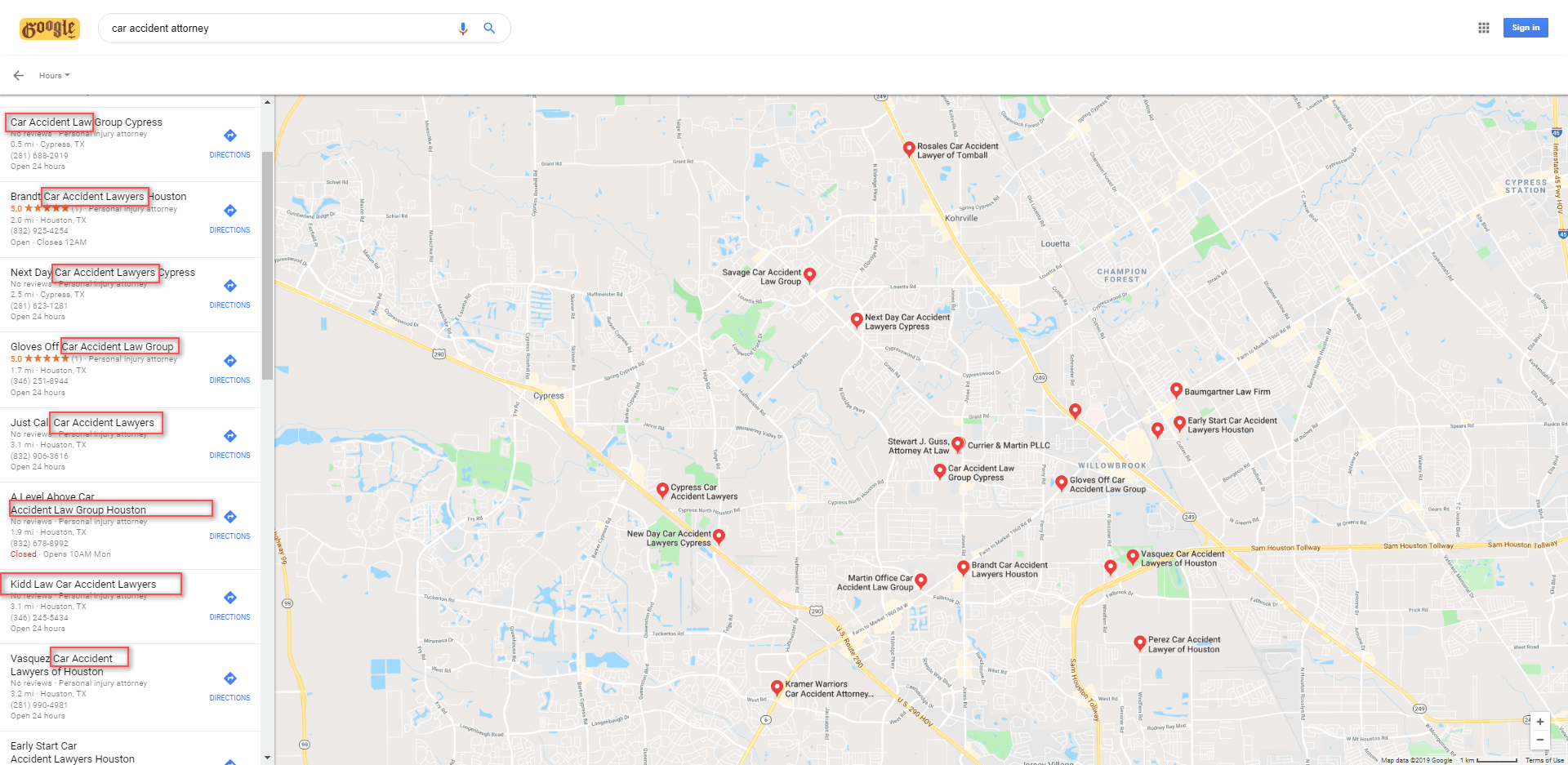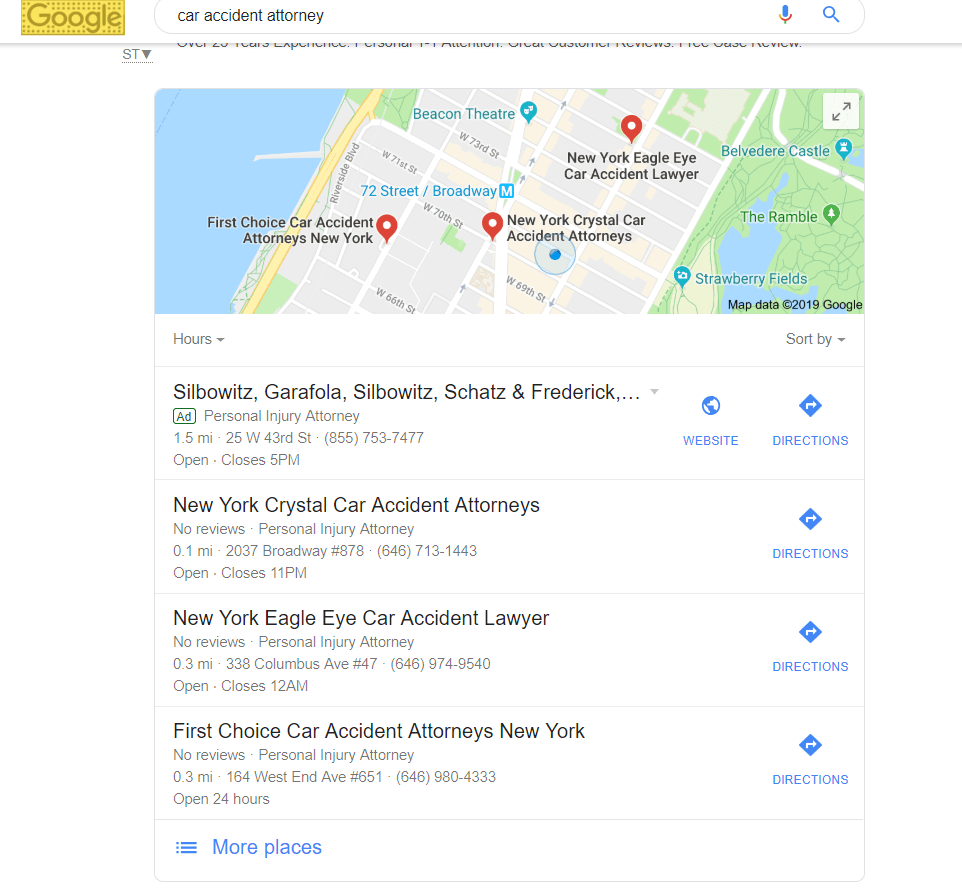 So how are these listings ranking? It’s simple, Google’s [stupid] local algorithm strongly favors listings that have words in their business name that match the searcher’s query. So the fact that these listings have the words “car accident” in them and are close to the user searching is making it possible for them to rank…with absolutely no other factors needed.