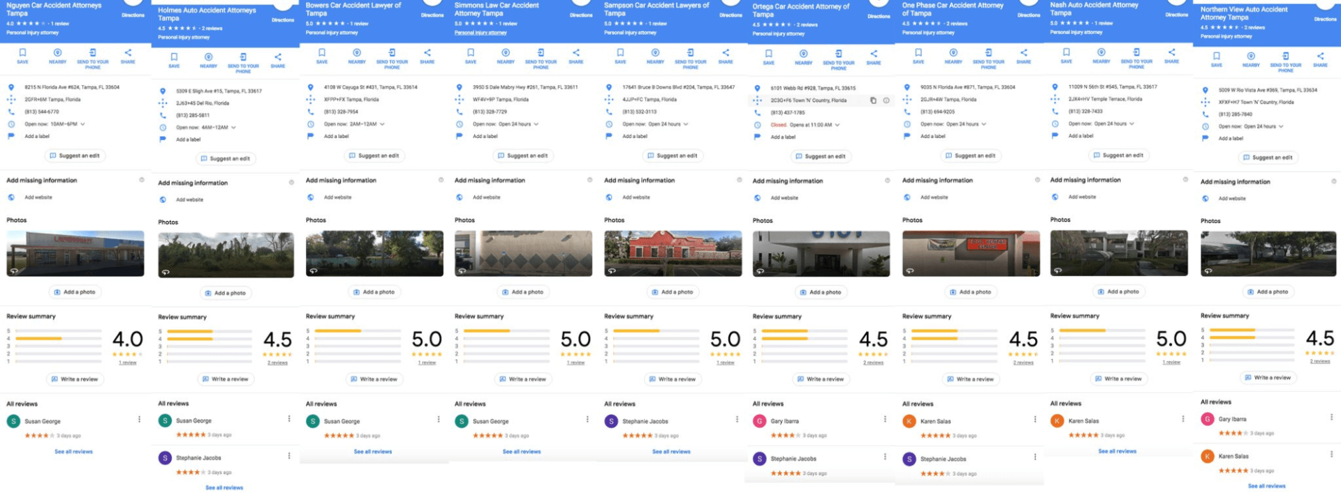 When you call the phone numbers on the listings, they take you to lead generating companies that ask if you need a personal injury lawyer. If asked, they will not identify what company they work for. Several attorneys I work with have told me they are being inundated with requests from lead providers who are selling these leads for hundreds of dollars each.
