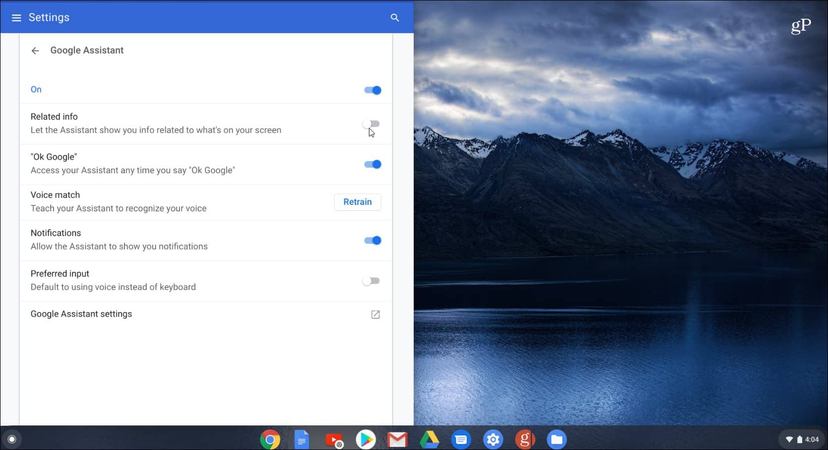 If you want to tweak more Assistant feature, hit Search + A or just say “OK Google” or “Hey Google” and then click Settings > Assistant > Chromebook. There you can do things like retrain your voice, allow notifications, voice or keyboard input and more.