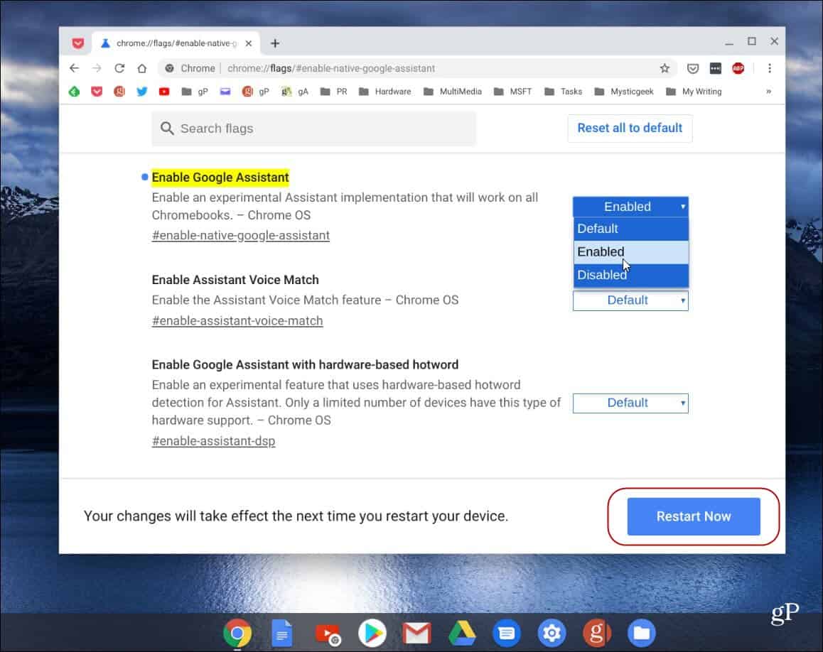 That highlight the “Enable Google Assistant” flag. Click the dropdown menu and choose Enabled. Then scroll to the bottom of the page and click the Restart Now button to restart your system for the changes to take effect.