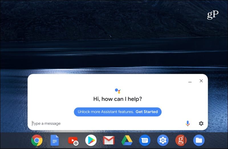After your Chromebook restarts, you can start using Assistant. Hit the keyboard shortcut Search + A to bring up the Google Assistant screen and type in your queries. Or, if you want it to be voice activated and enable more features and click the “Get Started” link.