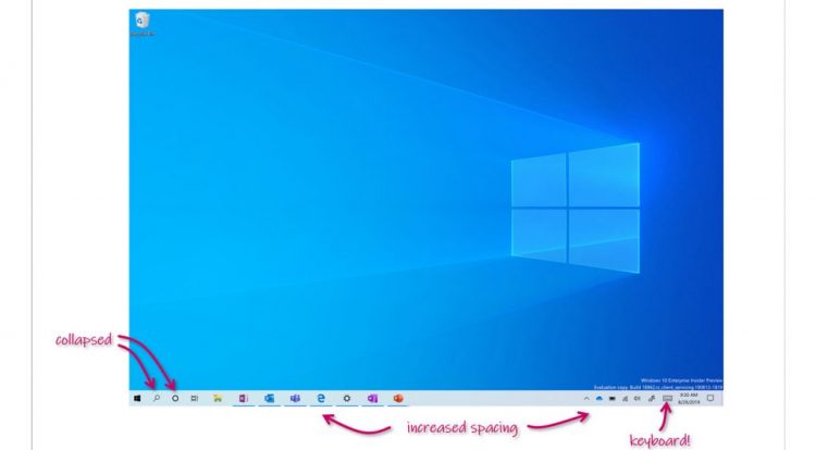 When disconnecting a 2-in-1 system from the keyboard in Build 18970, you’ll get a tweaked desktop UI that works better for touch. For one, the keyboard icon will appear in the system tray for easy access. Taskbar icons will also get a bit more space between them for easier tapping. The Search and Cortana buttons (if enabled) will collapse to a smaller tile as well. Lastly, the file explorer UI will switch to a touch-optimized layout.