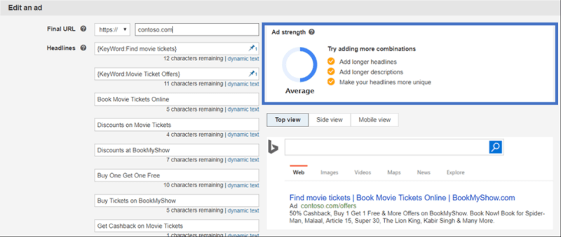 Microsoft suggests inputting at least 8 to 10 headlines that do not contain similar phrases and at least two descriptions that are distinct from each other with clear calls to action. Because the combinations can serve in any order, you’ll want to be sure your headlines and descriptions work together in various orders.