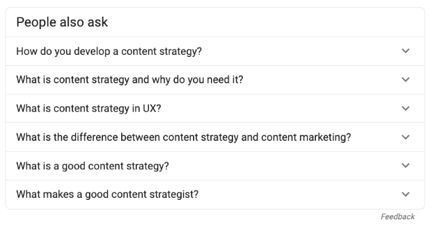 These are lists of frequently asked questions that Google has mapped to particular search terms. Clicking on any of these questions can lead to additional questions to include in your article. Google has done all the work, of which you can take advantage.