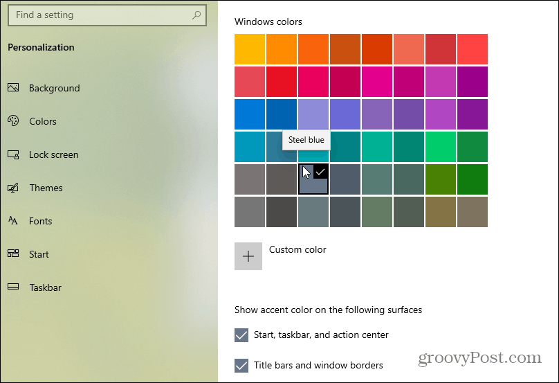 Next, go to the Colors tab and choose the accent color you want to use. You can have Windows automatically pick the color based on your background image or customize your own. Here you can also choose the surfaces where it shows up. Like the title bars or Action Center, for example.