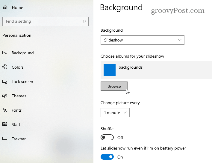 Note that you can also get rotating backgrounds, too. Whether they’re quality pictures you’ve taken yourself or HD images downloaded from the web, make sure to pop them into a single folder. Select Slideshow from the Background dropdown menu.