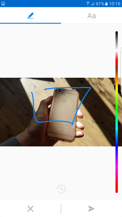 You can also send photos and videos from your camera roll by tapping the picture icon next to the camera icon. A gallery will pop up and you can scroll through the recent photos and videos and choose which ones you’d like to send. If you want to add a message, or annotate a photo to show off something important, then tap the edit icon (which looks like a pen) before sending. You can also draw atop photos and add text.