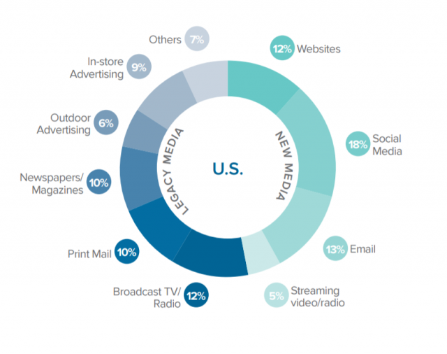 The American Marketing Association recently conducted the “Techlash Is Here” report, and statistics showed that the majority of average ad spend in the U.S. (18%) now goes toward social media. This is followed by email (13%), websites (12%) and streaming video/radio (5%), among all other forms of new media.