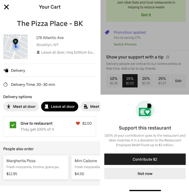 Uber Eats is asking customers in some locations to donate a set fee to support their favorite local restaurants. A contribution button now appears at checkout, in addition to any tip the customer chooses to give their delivery driver.