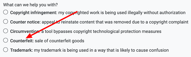 Google has updated its legal troubleshooter form to allow users to submit requests to take down counterfeit goods from the organic search results. This is similar to the DMCA request, in fact, it is the same form, but it can now also be used for removing counterfeit goods.