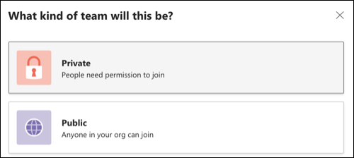 Next, decide if you want a Public or Private team. If you want anyone in your organization to be able to join, choose Public. But if you want to restrict members of the team, choose Private.