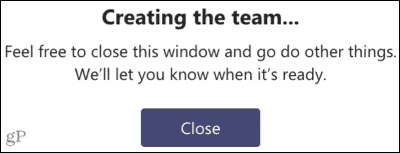 Hit the Create button, and you’ll see a message that your team is being set up. You can Close that window and continue working because you’ll be notified when your new team is ready. This should only take a few minutes.