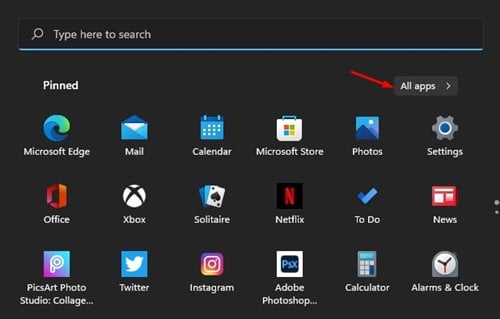 Step 3. Click on the ‘All Apps’ button on the Start menu, as shown in the screenshot.