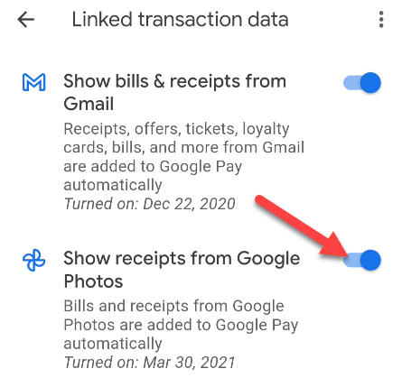 There are two toggles on this screen. The first one will allow Google Pay to find receipts from your Gmail. The second one will locate photos of receipts in your Google Photos library. Enable either one or both.