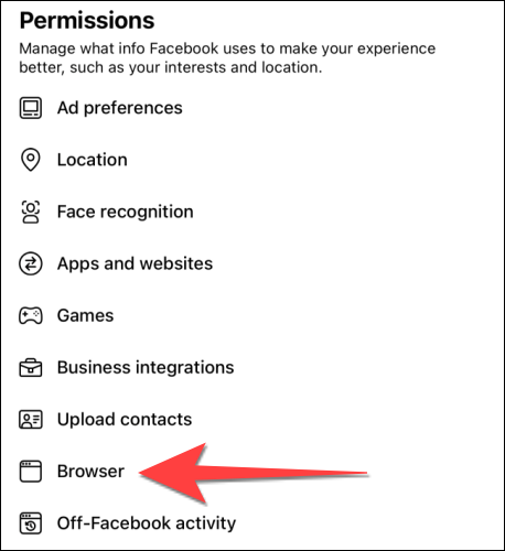 In Settings, scroll down to the “Permissions” selection and tap “Browser.”