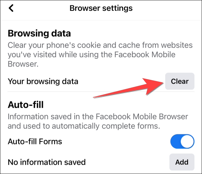 Under the “Browsing Data” section, tap the “Clear” button to remove all websites data gathered using Facebook Mobile Browser.