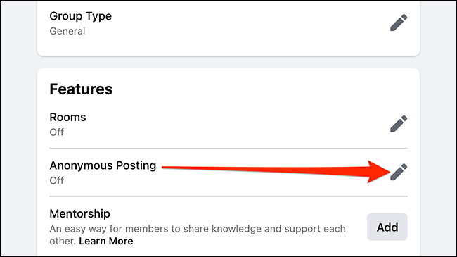 Scroll down the “Settings” page to “Features.” Here, next to “Anonymous Posting,” click the pencil icon.