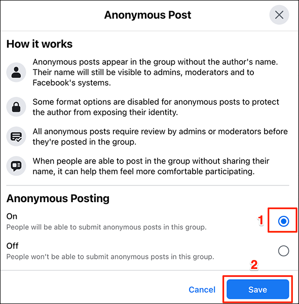 On the “Anonymous Post” window that opens, from the “Anonymous Posting” section at the bottom, choose “On.” Then, click “Save” at the bottom of the window.