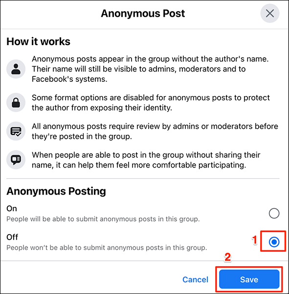 You can turn anonymous posts off in your group at any time, too. To do so, open the same “Anonymous Post” window. From the “Anonymous Posting” section, select “Off.” Then, click “Save” at the bottom of the window.