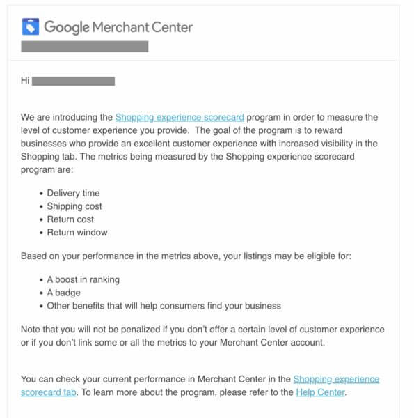 Google is notifying Google Merchant Center merchants of a new program called the Shopping experience scorecard. In short, Google is telling these merchants that if they provide an “excellent customer experience” Google will in turn reward those merchants with “a boost in rankings,” “a badge” and “other benefits that will help consumers find your business,” within the Google Shopping tab in Google Search.