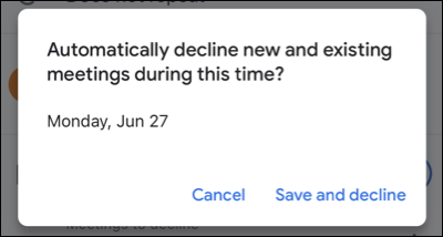 Select “Save” and then confirm you want to decline meetings during that timeframe by selecting “Save and Decline.”
