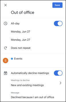 You can also set up an Out of Office event in the Google Calendar mobile app with all of the same options as on the web.