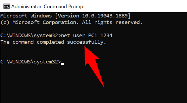 You’ll be asked to type in the new password twice, but you won’t see any text appear on the screen. Then Command Prompt will display a success message indicating your password was successfully changed.