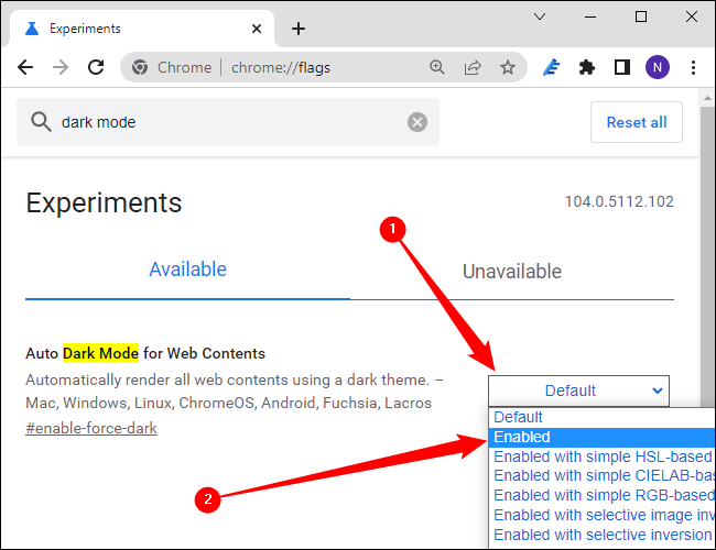Click the drop-down menu next to Force Dark Mode for Web Contents and select “Enabled.”