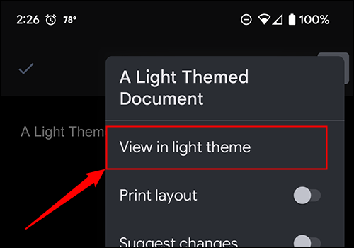 The user interface of the Google Docs app will still be in dark mode, but the page itself will be in light mode, with a standard white background and black text. The setting only applies to the current document — if you close the document and reopen it, it’ll be back in dark mode. The setting doesn’t affect other documents, either.