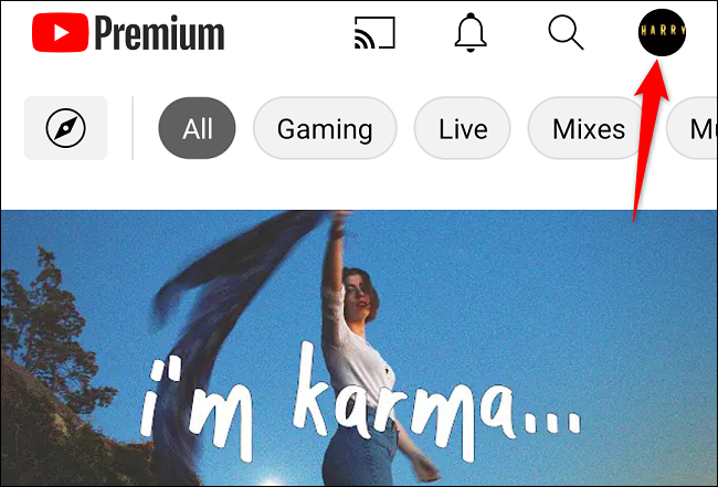 Next, launch the YouTube app on your phone. In the app’s top-right corner, tap your profile icon.